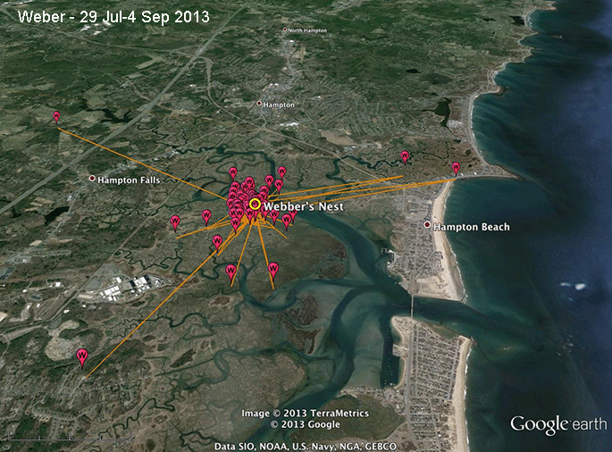Weber was a real stay-at-home. From Aug to 4 Sept, all but three of his locations were less than a mile (1.6 km) from his (Weber could be a female, but I'm sticking with our first call that it was a male) nest. The only points farther away than that are no more than 2.4 miles (3.9 km) or less from his nest.
