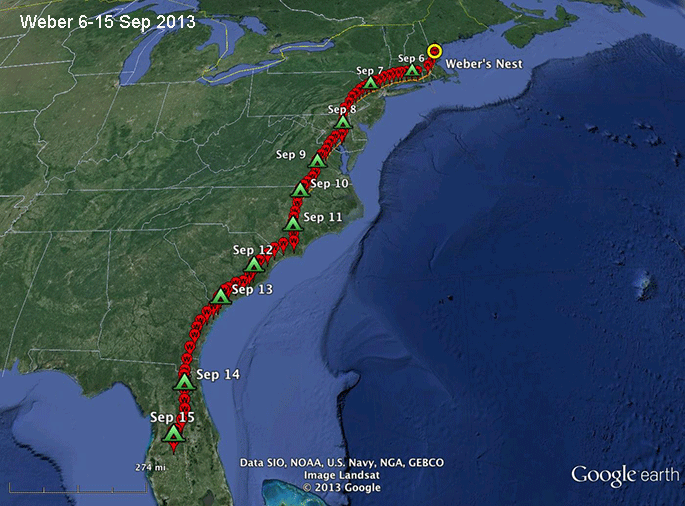 As of the 15th, Weber had been in full migration, with no days off. He has flown about 1,310 miles (2,100 km).